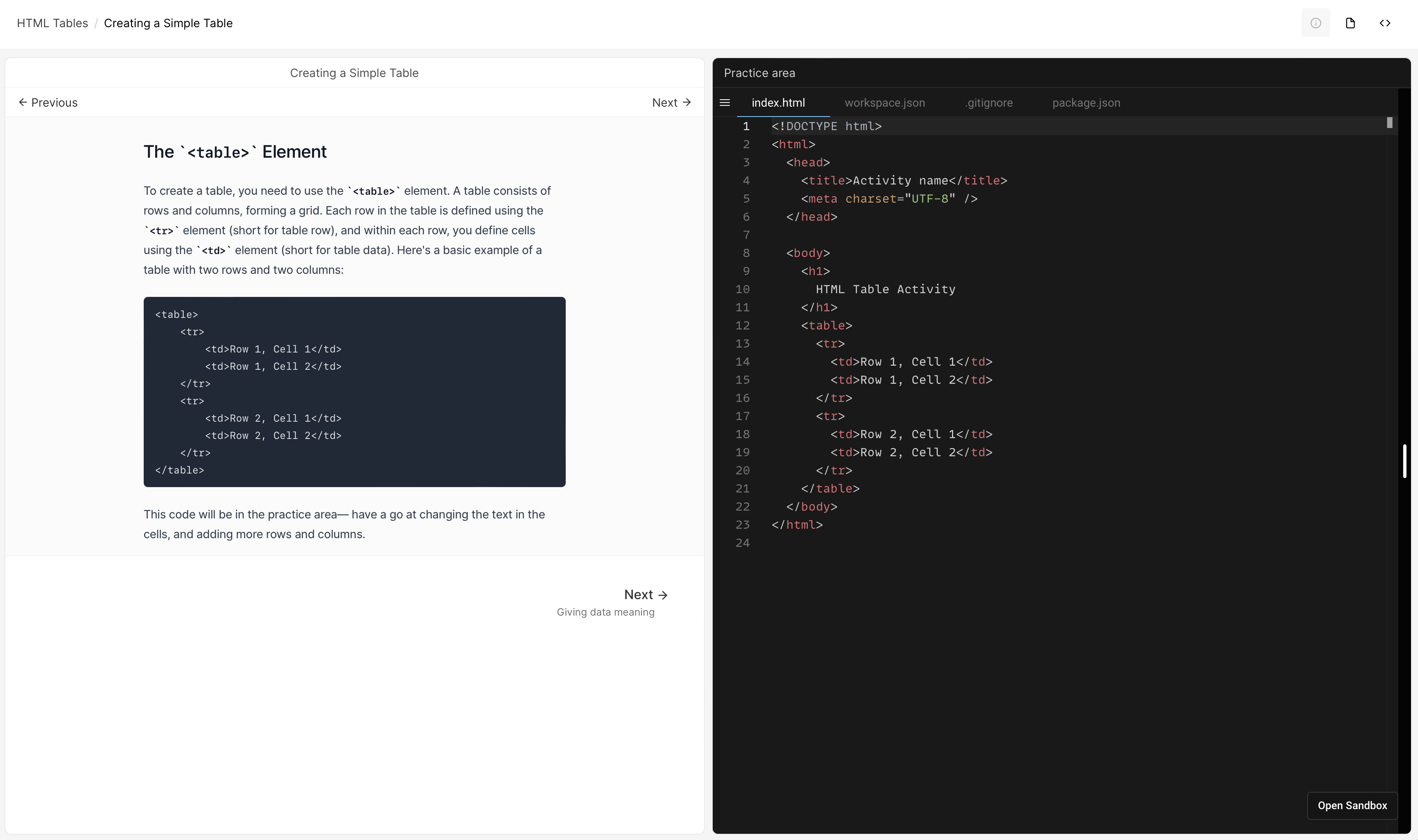 To offer students an interactive learning experience, I developed a platform internally codenamed Aileron. Aileron provides a simple interface for completing interactive coding tutorials.