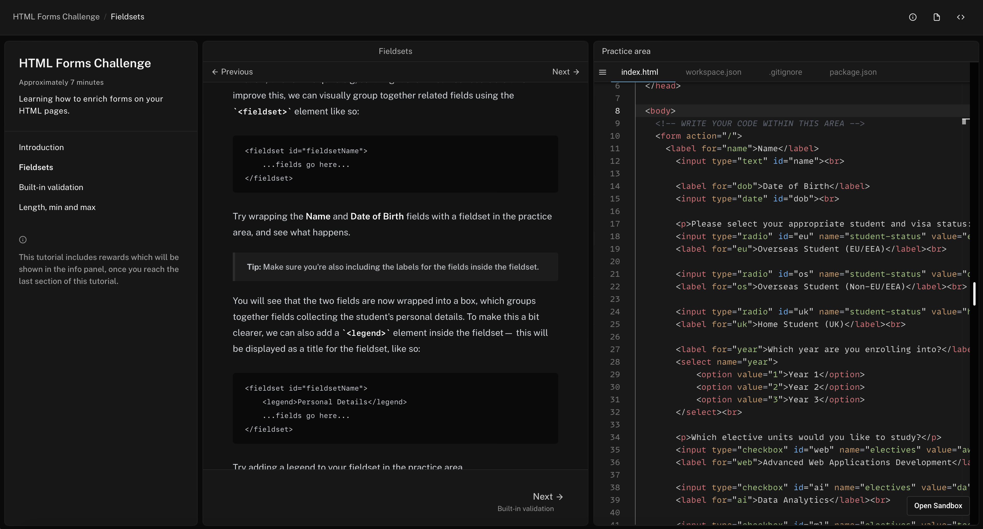 Using Aileron, instructors could embed pre-configured development environments into the tutorials (e.g. using StackBlitz, CodeSandbox). Allowing students to dive right in from their browser, without having to download or set anything up, meant that 89% of students engaged with the platform.