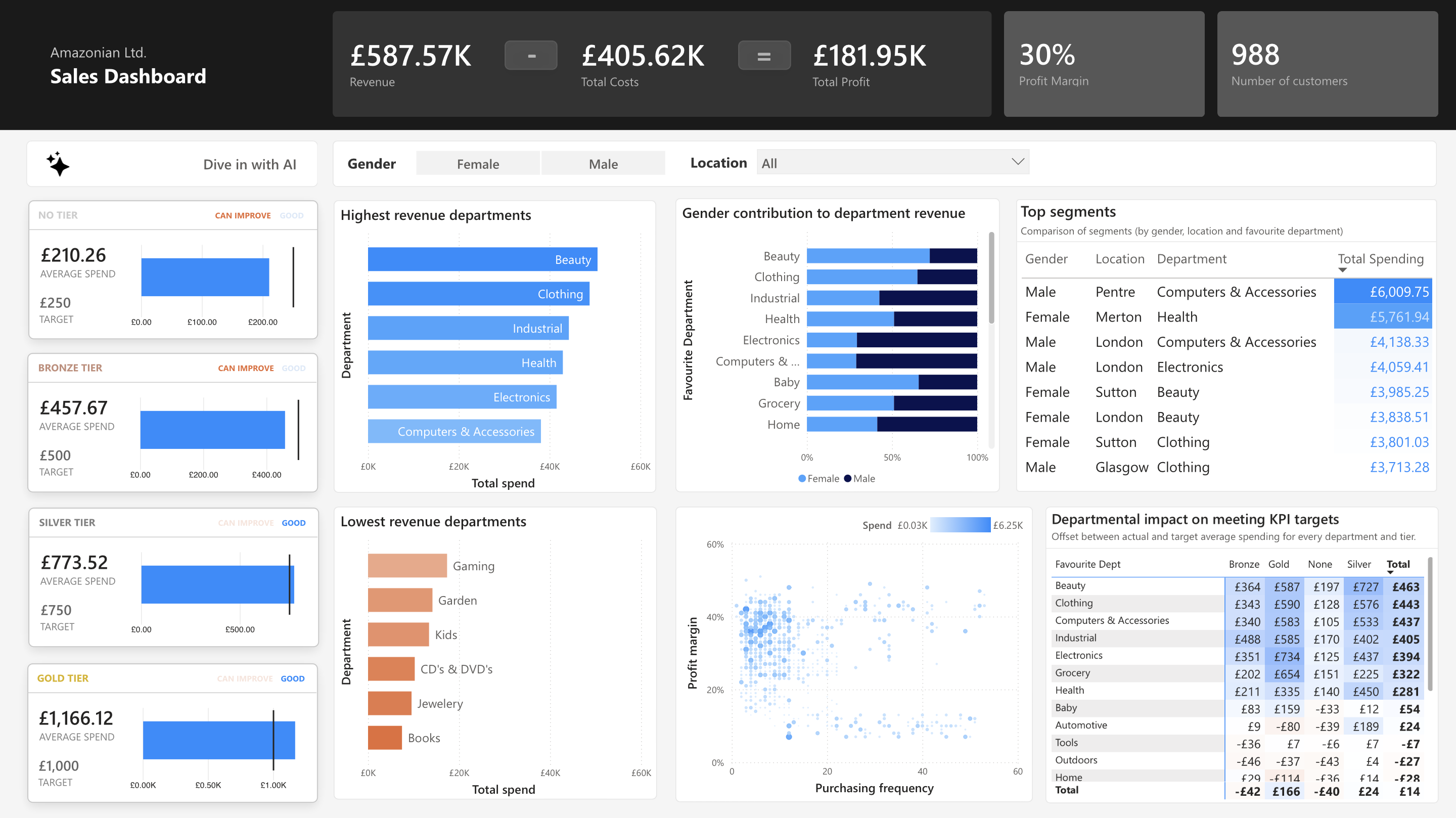 Using DAX to extract relevant data, different customer segments were inferred and compared, based on their contribution to sales revenue.